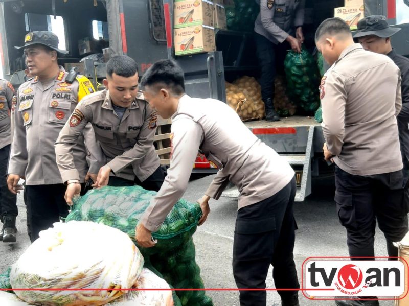 Bantuan terdiri dari Wortel 240 kg, Kentang 180 kg, Cabe merah 180 kg, Tomat 300 kg, Sawi putih 300 kg, Jipang 360 kg, Sarden kaleng 75 dus, Jahe merah 6 karung, Garam 60 bal, Bawang merah 6 karung, Bawang putih 6 karung, Beras 2 goni, Telur 2 papan, Mie instan 4 kotak.