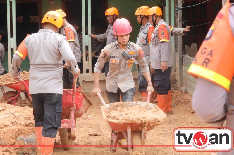 Tidak hanya fokus pada pembukaan jalan, personel di lapangan juga membantu warga yang rumahnya dipenuhi material longsor. Warga dan petugas tampak bergotong-royong membersihkan lumpur agar rumah kembali layak dihuni dan aman dari ancaman susulan.