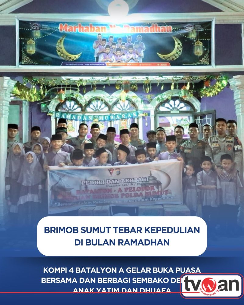 TVWAN.ID, MEDAN | — Semangat kepedulian dan kebersamaan di bulan suci Ramadhan terus ditunjukkan oleh personel Satuan Brimob Polda Sumatera Utara. Kali ini, personel Kompi 4 Batalyon A Sat Brimob Polda Sumut menggelar kegiatan sosial berupa buka puasa bersama sekaligus pemberian sembako dan tali asih kepada anak-anak yatim dan dhuafa di Griya Yatim & Dhuafa Medan, Senin (9/3/2026).