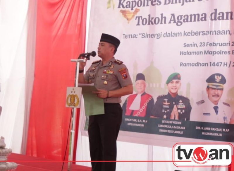 TVWAN.ID, BINJAI | – Menyambut bulan Suci Ramadhan 1447 Hijriah, Kapolres Binjai AKBP Mirzal Maulana, S.I.K., S.H., M.M., M.H., melaksanakan kegiatan Buka Puasa Bersama Forkopimda, Tokoh Agama dan Mahasiswa, di halaman Polres Binjai, jalan Sultan Hasanuddin No.1 Binjai., Senin (23/2/26).