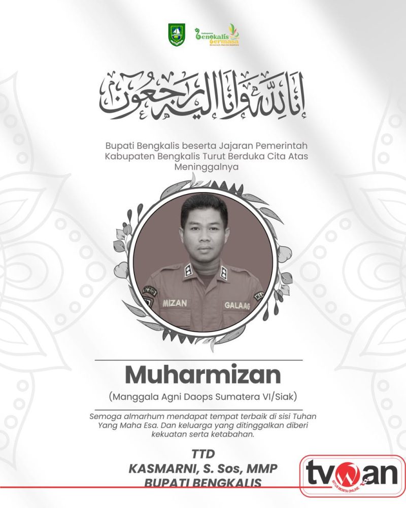 TVWAN.ID, BENGKALIS | – Bupati Bengkalis Kasmarni menyampaikan duka cita yang mendalam atas wafatnya salah satu pejuang kebakaran hutan dan lahan (karhutla), almarhum Muharmizan, yang gugur saat menjalankan tugas pemadaman karhutla di wilayah Kabupaten Bengkalis.