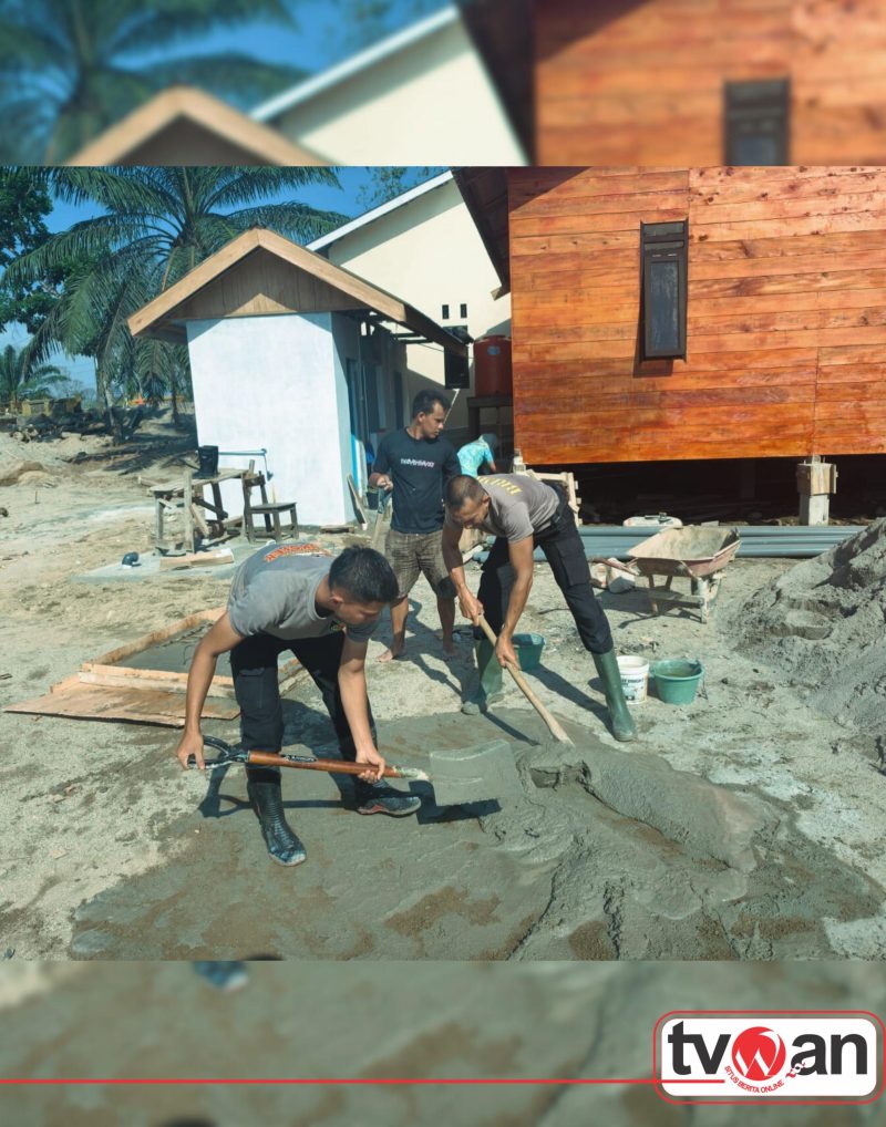 DankI-1 Penugasan AKP Antanius Tarigan, S.H., M.H., bersama personel yang bekerja berdampingan dengan masyarakat setempat. Dengan menggunakan peralatan sederhana seperti cangkul, sekop, dan beko sorong, proses pembangunan dilakukan secara gotong royong dan penuh kebersamaan.