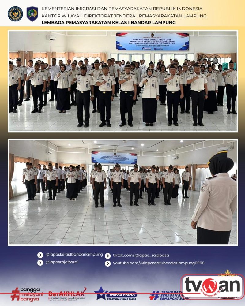 Tvwan.Id | Bandar Lampung,– Komitmen untuk mewujudkan pemasyarakatan yang bersih dan melayani dikukuhkan secara kolektif oleh jajaran Lembaga Pemasyarakatan (Lapas) Kelas I Bandar Lampung. Pada Rabu pagi (7/1/2026), Kepala Lapas (Kalapas) Ike Rahmawati memimpin langsung “Apel Pengucapan dan Penandatanganan Janji Kinerja Tahun 2026” yang diikuti oleh seluruh pejabat struktural dan petugas di lapangan apel utama.