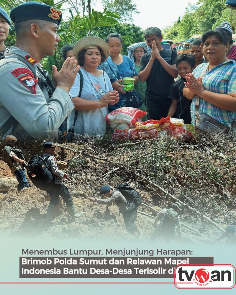 TVWAN.ID, TAPANULI TENGAH | – Jalan putus dan medan berat tidak pernah menghentikan langkah Brimob. Itulah yang terlihat pada Jumat (05/12/2025) ketika Personel Batalyon A Sat Brimob Polda Sumut, dipimpin Wadanki 3 IPTU Yauwardi, bersama relawan dari Yayasan Mapel Indonesia, bergerak menuju tiga desa yang terisolir akibat bencana di Kabupaten Tapanuli Tengah: Desa Perambunan, Desa Simaninggir, dan Desa Bonan Dolok.