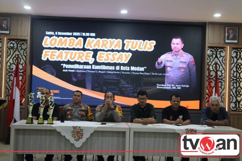 TVWAN.ID, MEDAN | – Dalam rangka mengoptimalkan peran media dalam menciptakan opini publik yang sehat terkait keamanan masyarakat, Kapolrestabes Medan Kombes Pol Dr. Jean Calvijn Simanjuntak, S.I.K., M.H menggelar Kapolrestabes Medan Cup – Lomba Karya Tulis Jurnalistik di Aula Patriatama Polrestabes Medan, Sabtu (6/12/2025). Kegiatan berlangsung mulai pukul 10.00 hingga 19.00 WIB dan diikuti puluhan wartawan dari berbagai media cetak maupun online.