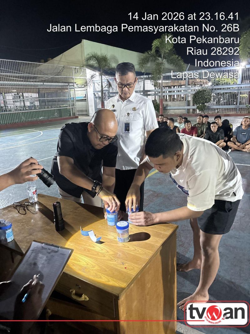TVWAN.ID, PEKANBARU | – Bentuk langkah nyata implementasi 15 Program Aksi Kementerian Imigrasi dan Pemasyarakatan (Kemenimipas) Tahun 2026, khususnya pada poin pemberantasan narkoba dan berbagai modus penipuan di lingkungan Lapas dan Rutan, jajaran Kesatuan Pengamanan dan Seksi Administrasi Keamanan dan Ketertiban Lembaga Pemasyarakatan (Lapas) Kelas IIA Pekanbaru kembali menggelar razia blok hunian serta tes urine bagi warga binaan. Razia dan tes urin ini dilaksanakan dengan tujuan untuk menjaga keamanan dan ketertiban di dalam Lapas serta mencegah terjadinya peredaran narkoba dan barang-barang terlarang lainnya, Rabu malam (14/01).