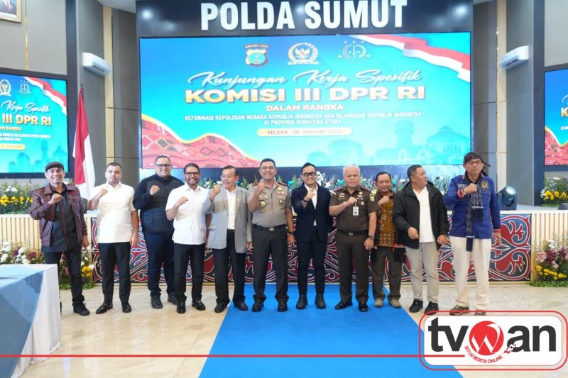 TVWAN.ID, MEDAN | – Komisi III Dewan Perwakilan Rakyat Republik Indonesia (DPR RI) melaksanakan kunjungan kerja spesifik dalam rangka Reformasi Polri dan Reformasi Kejaksaan Republik Indonesia di Provinsi Sumatera Utara, Jumat (30/1/2026). Kegiatan ini berlangsung di Aula Tibrata Polda Sumatera Utara.
