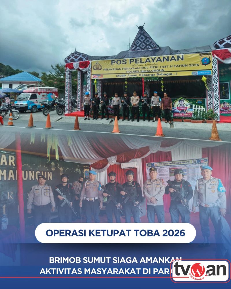 SUMUT, TVWAN.ID – Dalam rangka mendukung pelaksanaan Operasi Kepolisian Terpusat “Ketupat Toba 2026” guna memberikan pelayanan dan pengamanan pada perayaan Hari Raya Idul Fitri 1447 H, personel Batalyon B Pelopor Satuan Brimob Polda Sumatera Utara melaksanakan patroli pengamanan di kawasan Parapat, Kabupaten Simalungun, Sabtu (14/3/2026).