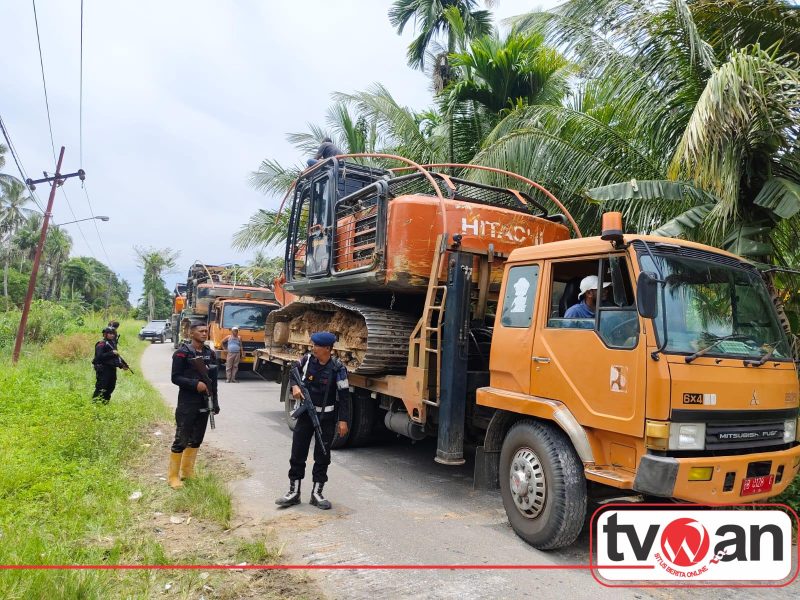 TVWAN.ID, MEDAN | – Personel Satuan Brimob bersama Direktorat Reserse Kriminal Khusus Polda Sumatera Utara mulai mengevakuasi alat berat ekskavator dari lokasi tambang emas ilegal di perbatasan Kabupaten Tapanuli Selatan dan Kabupaten Mandailing Natal, Rabu (4/3/2026).