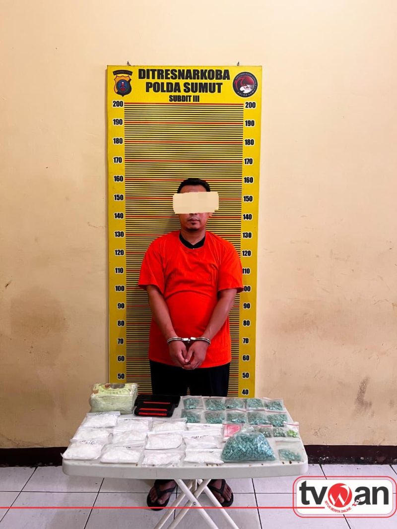 TVWAN.ID, MEDAN | – Direktorat Reserse Narkoba Polda Sumatera Utara kembali mengungkap kasus peredaran narkotika dalam jumlah besar. Seorang pria berinisial AS (39), yang diketahui berprofesi sebagai guru swasta, diamankan petugas bersama barang bukti sabu seberat lebih dari dua kilogram serta ribuan butir pil diduga ekstasi.