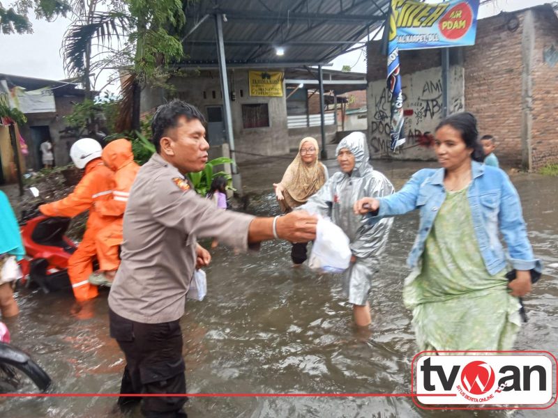 Selain memantau situasi, personel juga memberikan bantuan nasi bungkus dan air minum kepada warga yang terdampak banjir sebagai bentuk kepedulian dan dukungan kepada masyarakat.