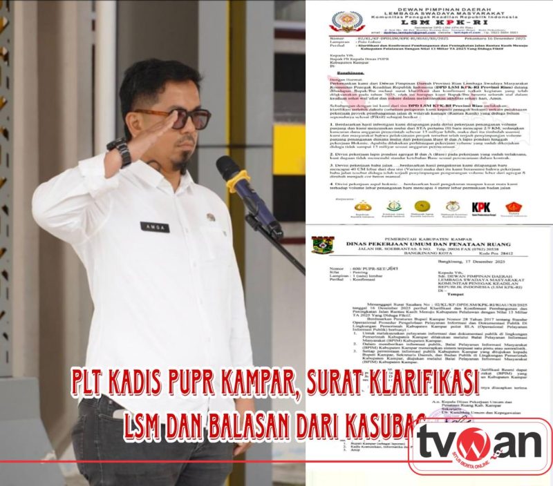 Kampar, tvwan.id – Dewan Pimpinan Daerah Lembaga Swadaya Masyarakat Komunitas Penegak Keadilan Republik Indonesia (DPD LSM KPK-RI) Provinsi Riau secara resmi melayangkan surat klarifikasi dan konfirmasi kepada Dinas Pekerjaan Umum dan Penataan Ruang (PUPR) Kabupaten Kampar terkait kegiatan Pembangunan dan Peningkatan Jalan APBD Kampar yang seharusnya volume panjang penanganan _+ 5 km ternyata progres dilapangan baru mencapai 3 km PHO cair 13 miliaran 2025 yang diduga fiktif.