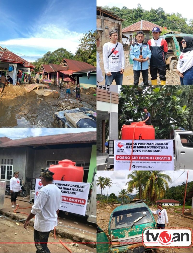 TVWAN.ID | PADANG,– Dewan Pimpinan Daerah (DPD) Gajah Muda Nusantara (GMN) Kota Pekanbaru menyalurkan bantuan logistik sekaligus membangun Posko Air Bersih Gratis bagi korban bencana alam di Kampung Batu Busuk, Kelurahan Lambung Bukit, Kecamatan Pauh, Kota Padang, Provinsi Sumatra Barat.