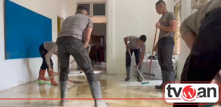 Brimob Polda Sumut Turun Tangan Bersihkan SMP Negeri 1 Tanjung Pura Pasca Banjir