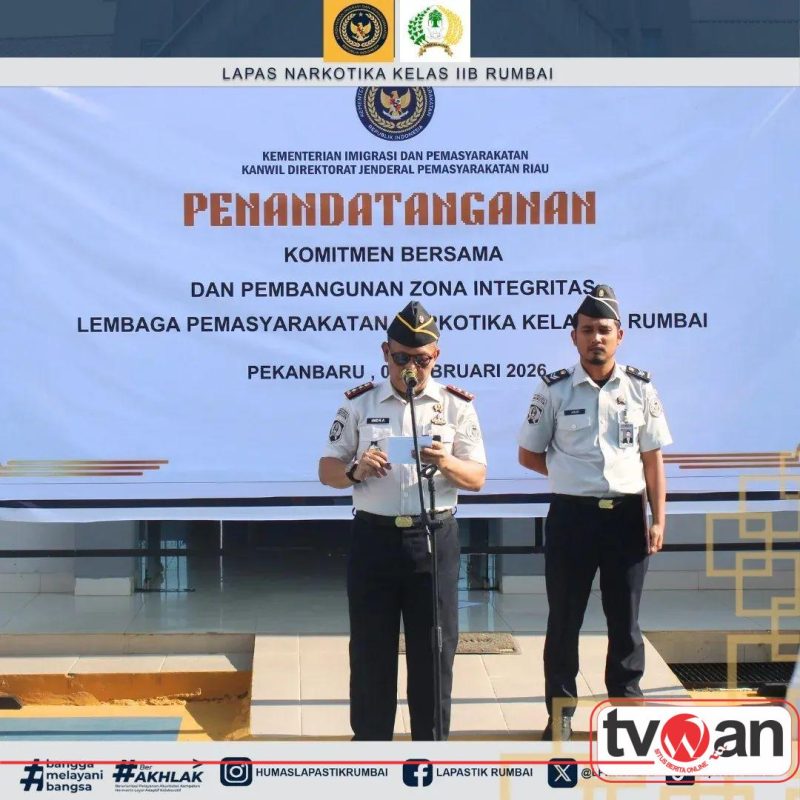 Tvwan.Id | Pekanbaru,– Lembaga Pemasyarakatan (Lapas) Narkotika Kelas IIB Rumbai melaksanakan kegiatan Penandatanganan Komitmen Bersama Pembangunan Zona Integritas sebagai wujud nyata komitmen dalam mewujudkan tata kelola pemerintahan yang bersih, transparan, dan berintegritas, Senin (9/2/2026).