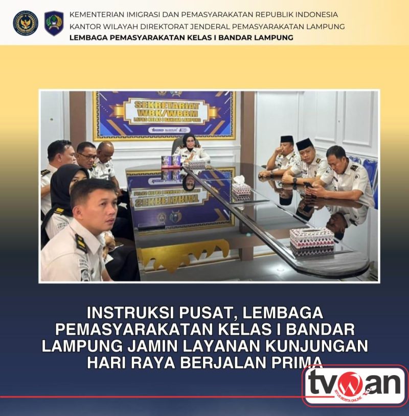 Tvwan.Id | Bandar Lampung,– Menjelang datangnya Hari Raya Idul Fitri tahun 1447 Hijriah, persiapan layanan tatap muka bagi keluarga warga binaan terus dimatangkan secara menyeluruh. Guna menyamakan persepsi dan memastikan kesiapan di lapangan, Kepala Lembaga Pemasyarakatan Kelas I Bandar Lampung, Ike Rahmawati, beserta seluruh jajaran pejabat struktural mengikuti kegiatan Pengarahan Kesiapan Layanan Kunjungan Hari Raya pada Selasa pagi, 17 Maret.