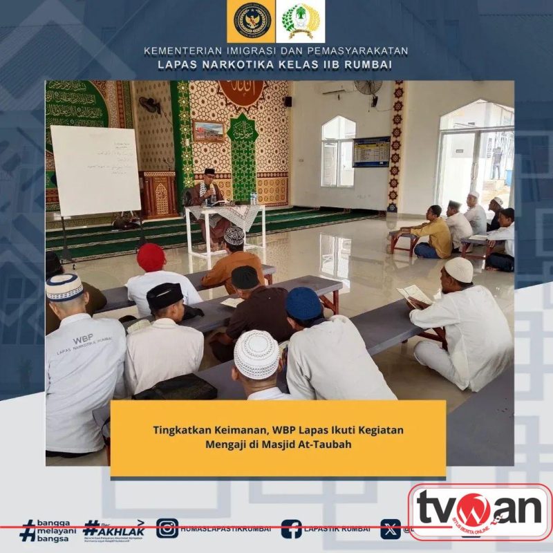 Tvwan.Id | Pekanbaru,– Dalam upaya pembinaan kepribadian dan peningkatan keimanan, Warga Binaan Pemasyarakatan (WBP) mengikuti kegiatan mengaji Al-Qur’an yang dilaksanakan di Masjid At-Taubah Lapas (09/02/26). Kegiatan ini rutin digelar sebagai bagian dari program pembinaan kerohanian bagi WBP beragama Islam.