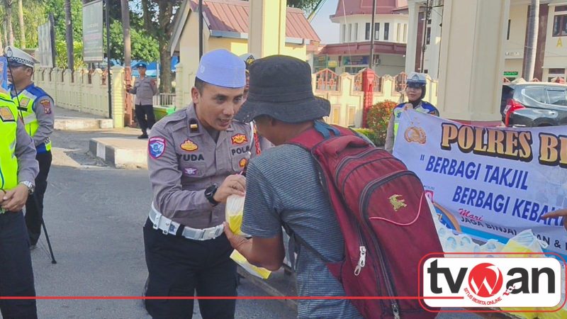 TVWAN.ID, BINJAI | – Personel Polres Binjai membagikan takjil berbuka puasa kepada masyarakat yang melintas di depan Mapolres Binjai, Jalan Sultan Hasanuddin No. 1, Kota Binjai, Sumatera Utara, Rabu (25/2/2026).
